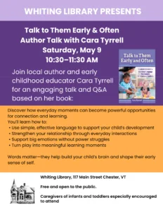 This author chat with Ms. Cara Tyrrell will be held at Whiting Library on Saturday, May 9, 10:30AM, offering caregivers and families the opportunity to ask questions and receive additional guidance on applying these communication strategies at home.