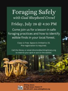 Chester, VT- The Whiting Library, 117 Main St. in Chester, will host a Foraging Safely class with Gaal Shepherd Crowl on Friday, July 28, 2023 at 4:30 PM.