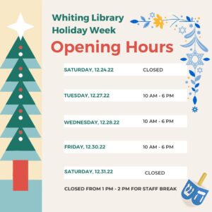 The Whiting Library will have adjusted hours during the holiday week. We will be closed on Saturday, 12/24/22 and Saturday, 12.31.22. May the warmth of sun rays and good books brighten your winter.