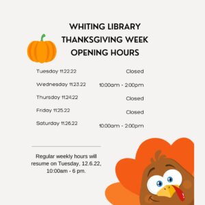 Whiting Library will be closed on Tuesday, November 22nd and Friday, November 25th during the week of Thanksgiving. The library will be open on Wednesday, November 23 from 10:00 am to 2 pm and on Saturday, November 26th from 10:00 am to 2 pm.